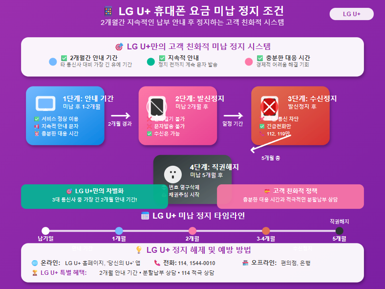 LG U+는 고객 친화적인 정지 정책으로 유명해요. 미납 발생 즉시 정지하는 것이 아니라, 2개월간의 안내 기간을 통해 고객이 충분히 대응할 수 있는 시간을 제공합니다.