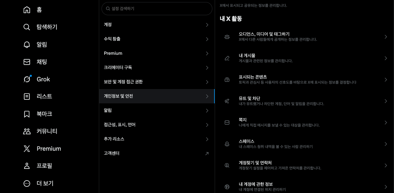 x.com 또는 twitter.com에 접속하여 로그인합니다. 화면 왼쪽 메뉴에서 더보기(점 3개 아이콘)를 클릭한 후, 나타나는 메뉴에서 설정 및 개인정보를 선택합니다.